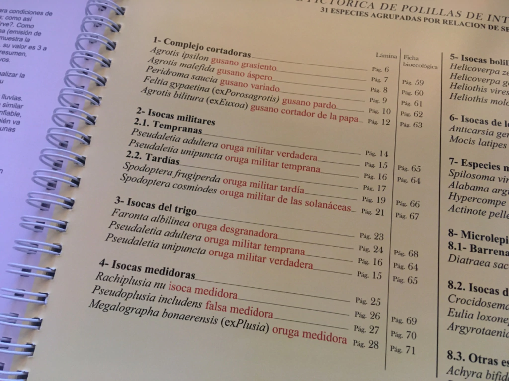 El trabjo es una clave para identificar 31 especies de polillas (mariposas de hábitos nocturnos) ue afectan cultivos extensivos en Argentina. Es una herramienta tecnológica y no un trabajo de taxonomía clásica. Contiene 120 fotografías a color con indicaciones de caracteres útiles para su precisa identificación bajo condiciones de campo. Es una clasificación basada en el concepto de relación de semejanza, un primer agrupamiento de especies es por tamaño, luego por cultivos que ataca, momentos de aparción en un mismo cultivo o tipo de daños. Además, en un anexo organizado en fichas individuales se describen aspectos bioecológicos detallando ubicación taxonómica, descripción de sus estados de desarrollo (huevo, larva, pupa y adulto). Su utilidad radica en brindar apoyo a una red de trampas de luz distribuidas en todo el pais, que faciliten elaborar Sistemas de Alerta Sanitario sobre insectos plaga. Resulta de interés para estudiantes de ciencias agrarias, investigadores, plagueros (profesionales que ofrecen el Servicio de Monitoreo de Cultivos) y productores agropecuarios.