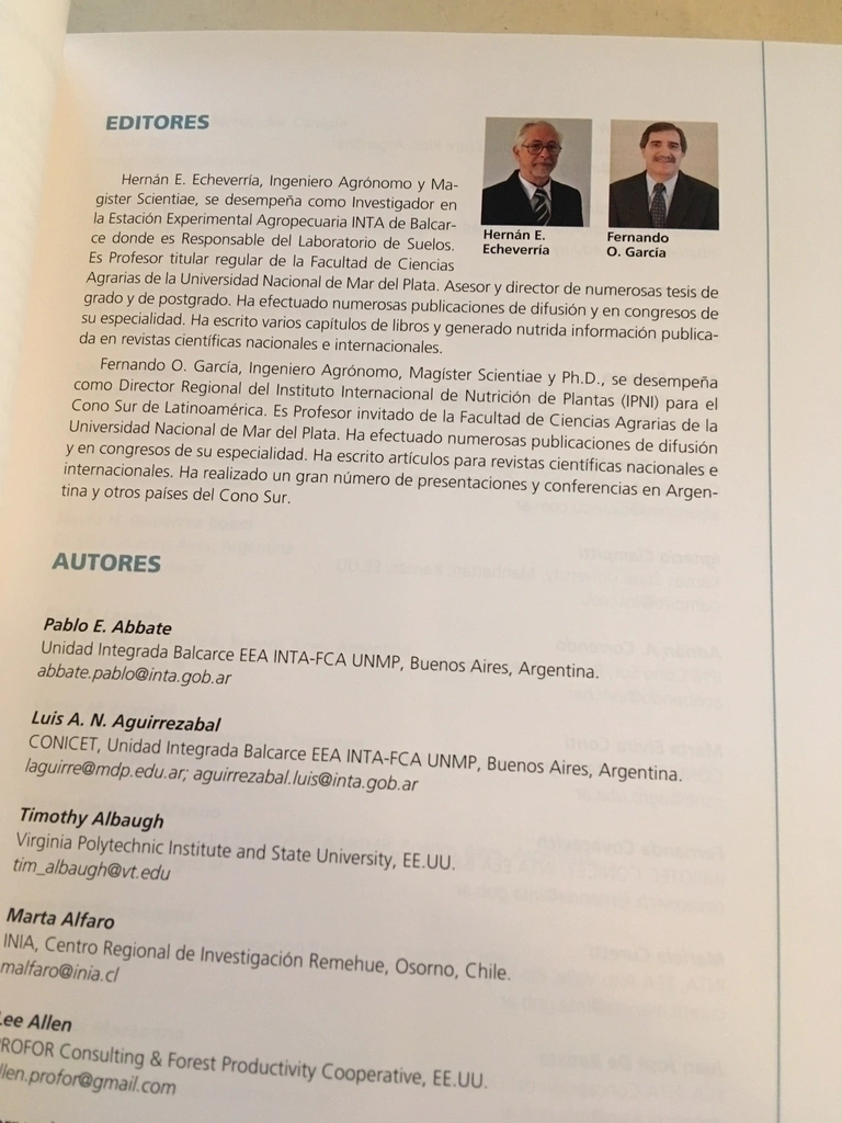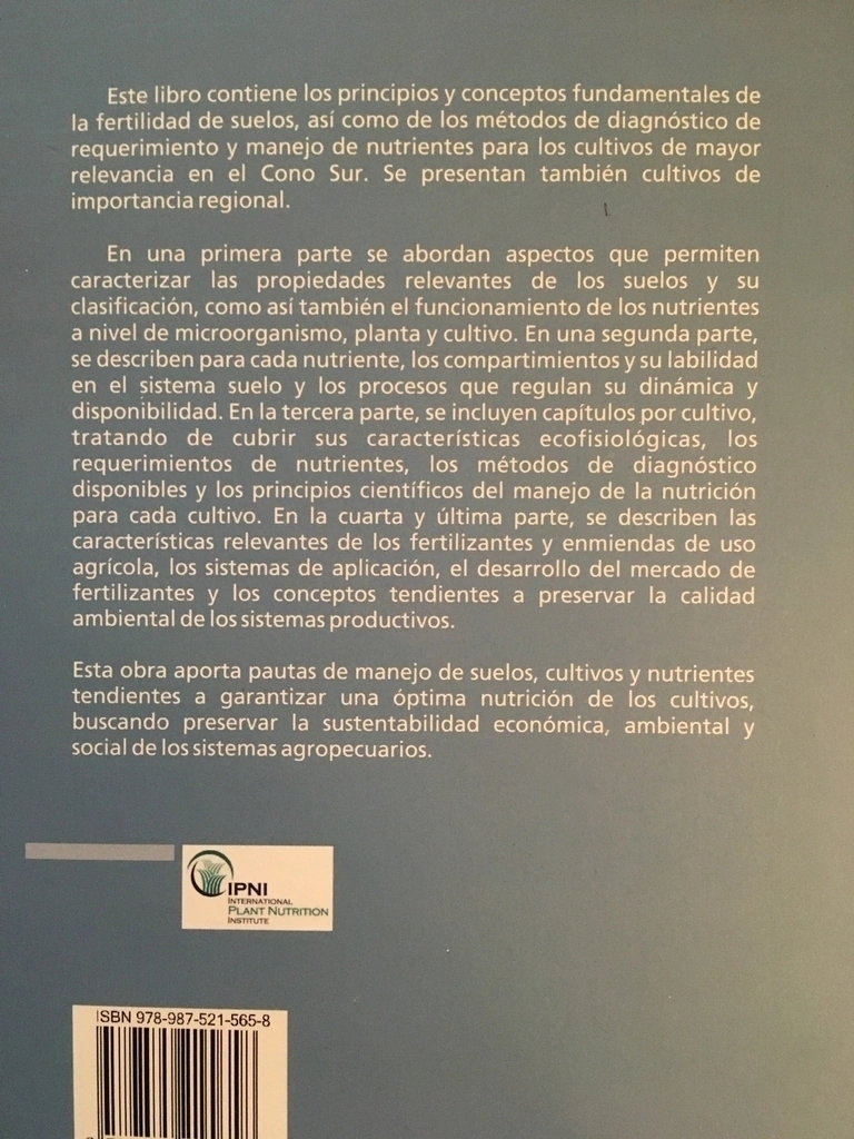 Este libro contiene los principios y conceptos fundamentales de la fertilidad de suelos, así como los métodos de diagnóstico de requerimiento y manejo de nutrientes para los cultivos de mayor relevancia en el Cono Sur. Se presentan también cultivos de importancia regional.