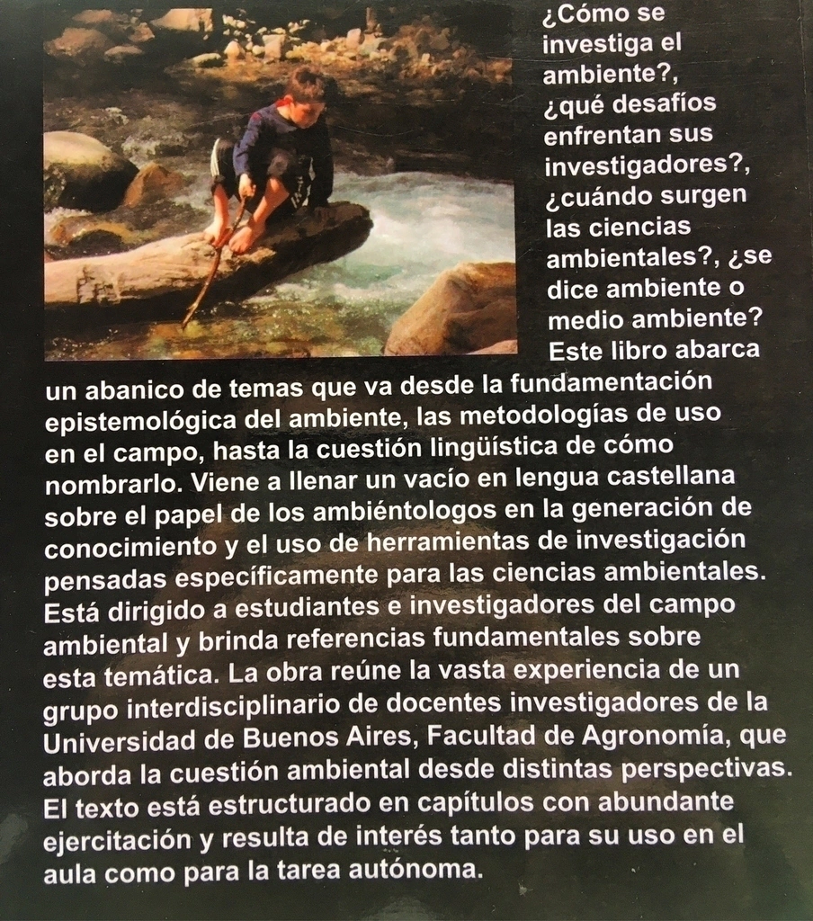 ¿Cómo se investiga el ambiente?, ¿qué desfíos enfrentan sus investigadores?, ¿cuándo surgen las ciencias ambientales?, ¿se dice ambiente o medio ambiente? Este libro abarca un abanico de temas que va desde la fundamentación epistemológica del ambiente, las metodologías de uso en el campo, hasta la cuestión lingüistica de cómo nombrarlo. Viene a llenar un vacío en lengua castellana sobre el papel de los ambiéntologos en la generación de conocimiento y el uso de herramientas de investigación pensadas específicamente para las ciencias ambientales. Está dirigido a estudiantes e investigadores del campo ambiental y brinda referencias fundamentales sobre esta temática. La obra reúne la vasta experiencia de un grupo interdisciplinario de docentes investigadores e la Universidad de Buenos Aires, Facultad de Agronomía, aque aborda la cuestión ambiental desde distintas perspectivas. El texto está estructurado en capítulos con abundante ejercitación y resulta de interés tanto para su uso en el aula como para la tarea autónoma.