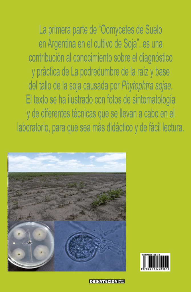 La primera parte de "Oomycetes de Suelo en Argentina en el cultivo de Soja", es una contribución al conocimiento sobre el diagnóstico y práctica de La podredumbre de la raíz y base del tallo de la soja causada por Phytophtora sojae. El texto se ha ilustrado con fotos de sintomatología y de diferenes técnicas que se llevan a cabo en el laboratorio, para que sea más didáctico y de fácil lectura.